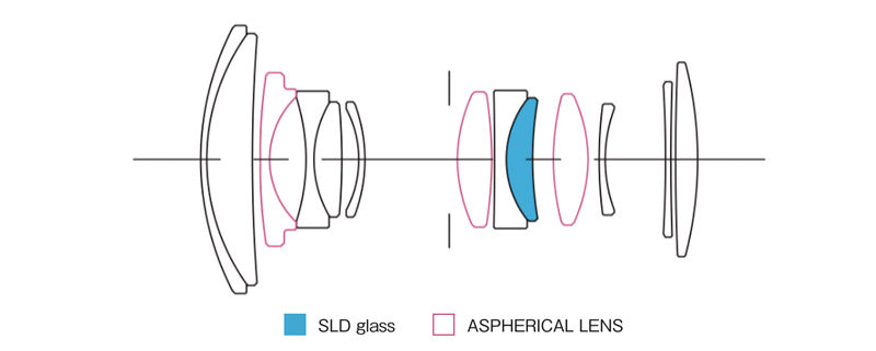 10 groups, 13 elements (1 SLD and 3 Aspherical lenses)
